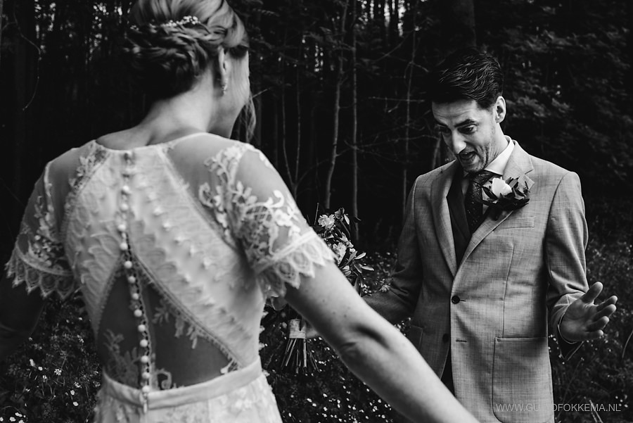 In veel gevallen haalt de bruidegom de bruid op en ontmoeten ze elkaar bij de voordeur. Vaak niet de meest ideale setting vanwege de beperkte beweginsruimte en tja, laten we eerlijk zijn, (meestal) ook niet de meest sfeervolle omgeving. Daarom word ik extra blij als een bruidspaar ervoor kiest om elkaar voor het eerst te zien op een aparte en sfeervolle plek: de zogenaamde ‘first look’. Jordy en Suzanne kozen hiervoor het bos van Neerijnen.