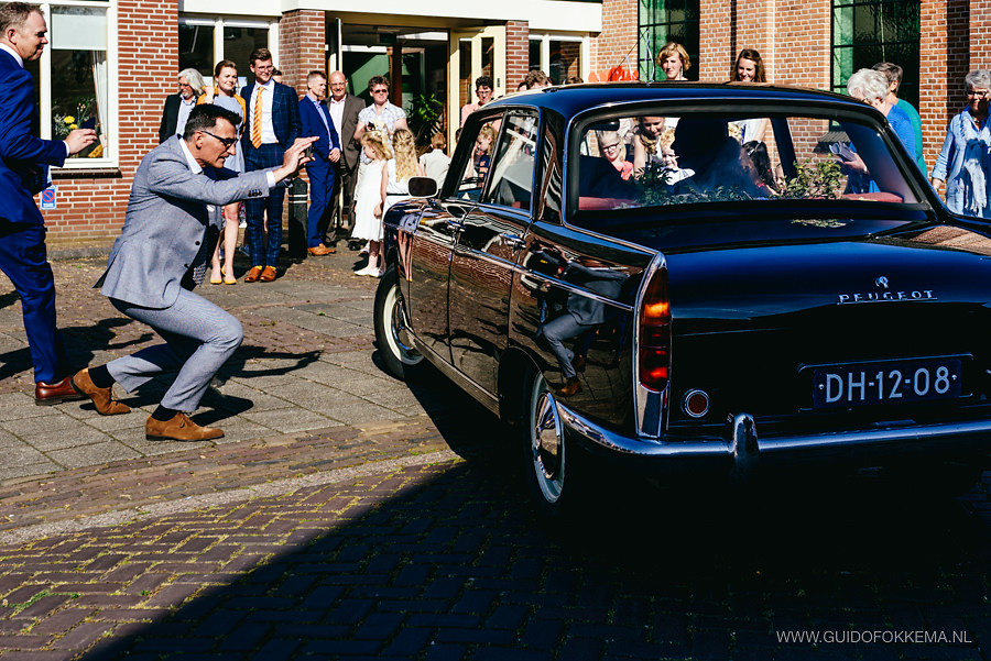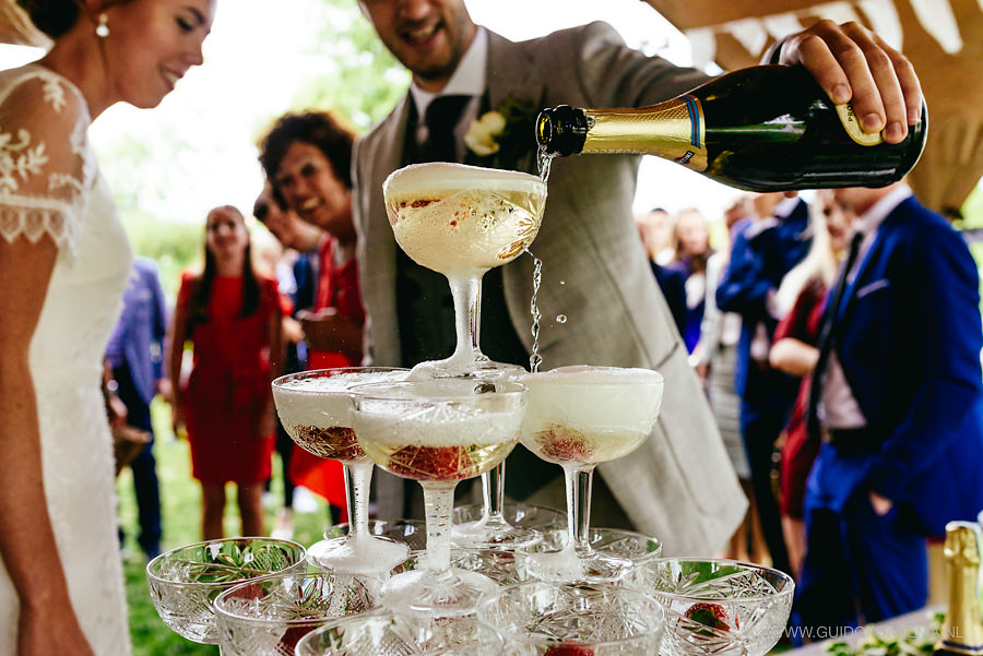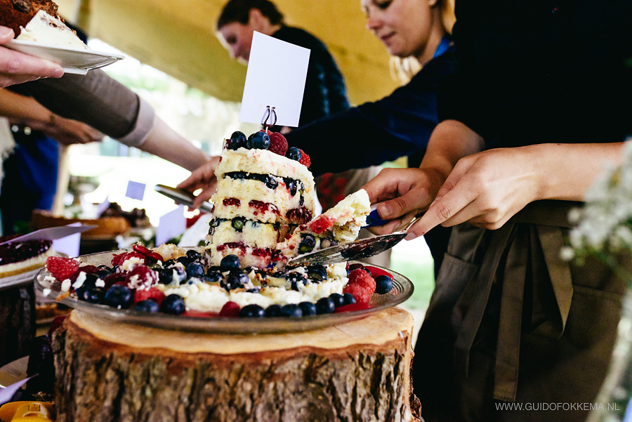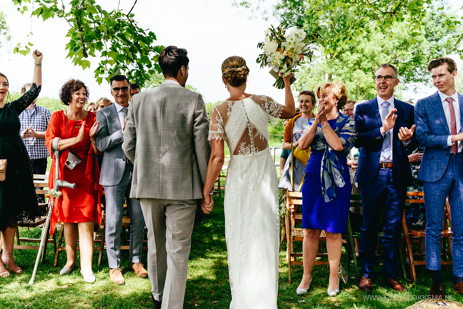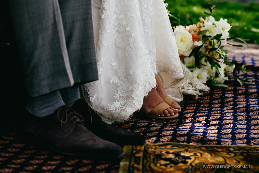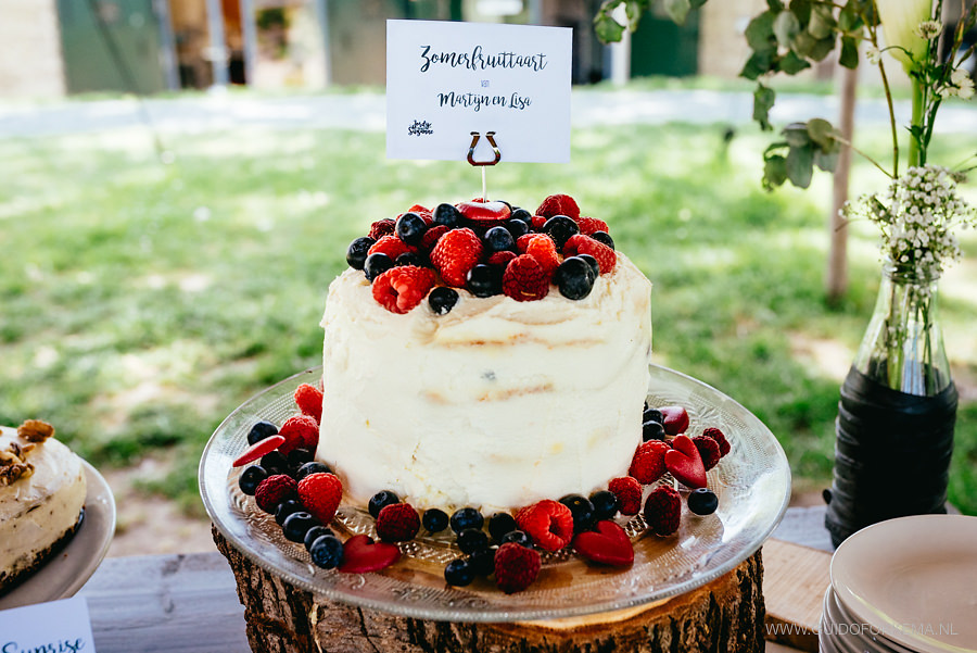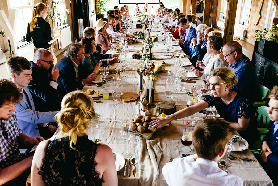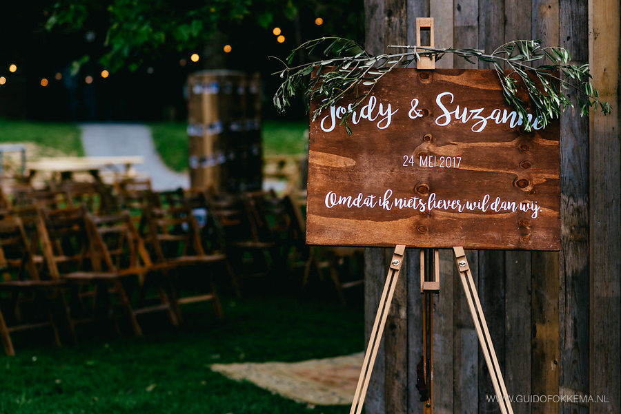 Maar zo nu en dan maak ik een bruiloft mee waar er zoveel toffe elementen bij elkaar komen en op elkaar aansluiten dat er iets speciaals ontstaat. En dat was bij de bruiloft van Jordy en Suzanne. Werkelijk alles ademde het karakter van hun warme en creatieve persoonlijkheden. Van zelfgeschreven beloftes en ontroerende speeches tot zelfgemaakte taarten (jaja, meervoud) door de daggasten. Van een zelfgemaakte trouw- en menukaart tot lekker uitbundige feesten. Van loungen in een chesterfield bank op perzische tapijten tot rondrijden in een Peugeot oldtimer. Van een champagnetoren met glazen van Jordy’s werk tot het massaal vlinders oplaten met de leerlingen van Suzannes klas. En ga zo maar door.