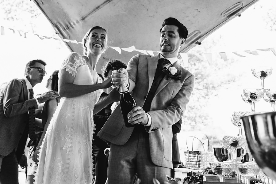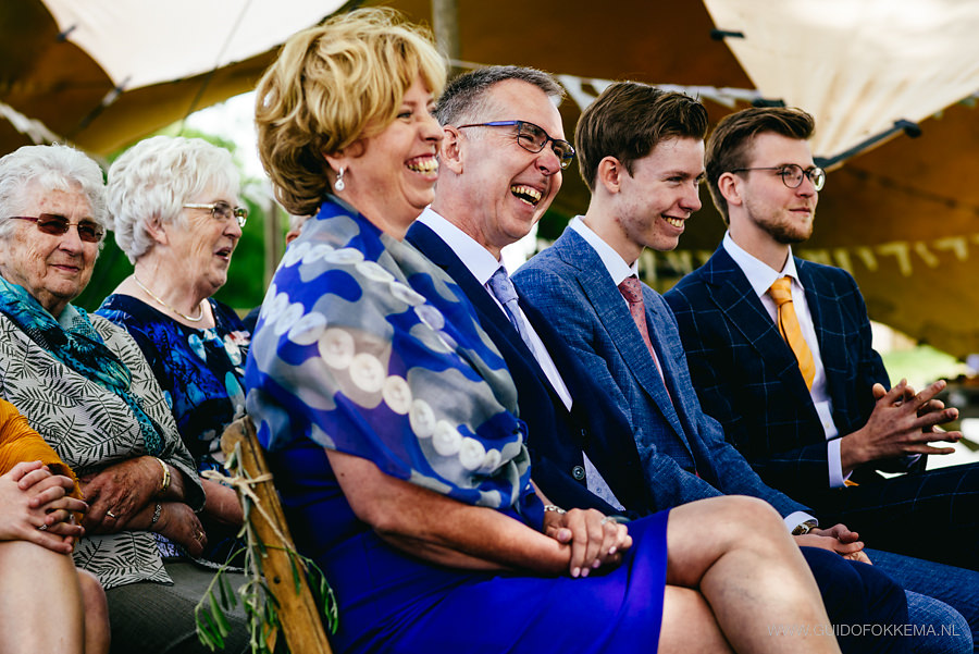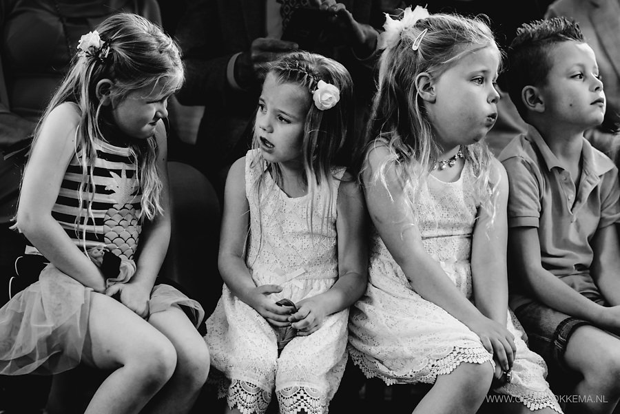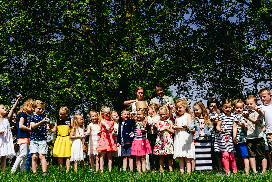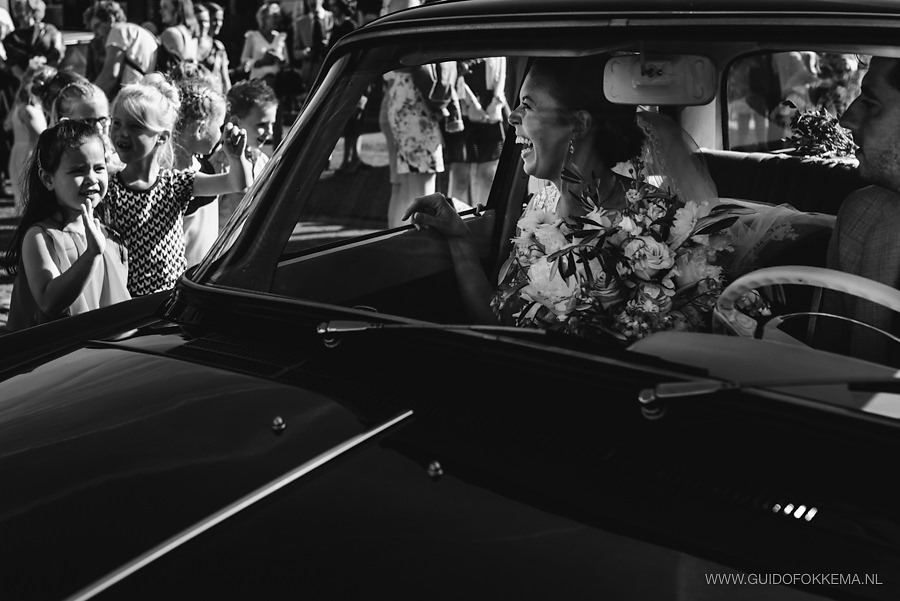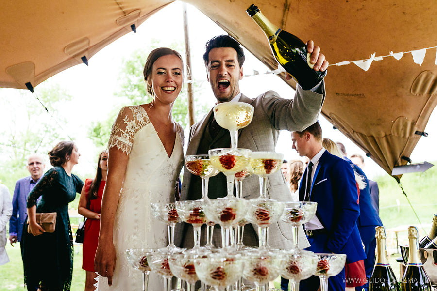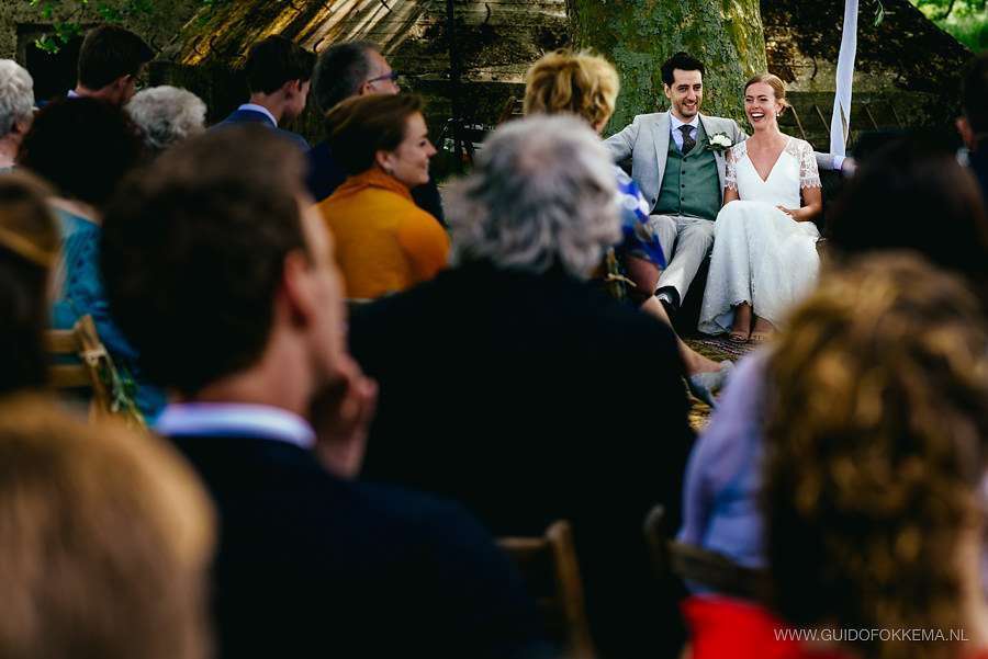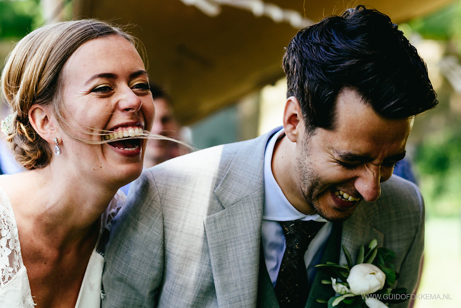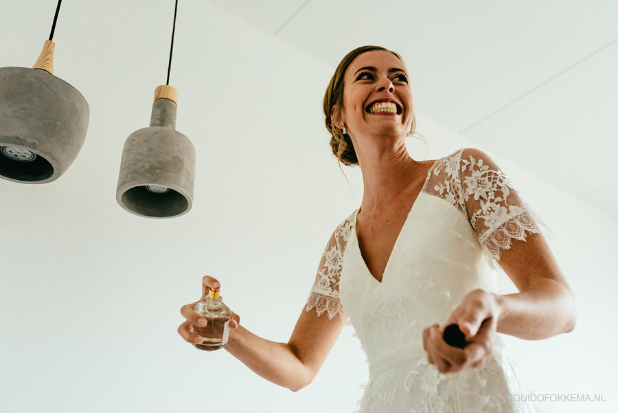 Maar zo nu en dan maak ik een bruiloft mee waar er zoveel toffe elementen bij elkaar komen en op elkaar aansluiten dat er iets speciaals ontstaat. En dat was bij de bruiloft van Jordy en Suzanne. Werkelijk alles ademde het karakter van hun warme en creatieve persoonlijkheden. Van zelfgeschreven beloftes en ontroerende speeches tot zelfgemaakte taarten (jaja, meervoud) door de daggasten. Van een zelfgemaakte trouw- en menukaart tot lekker uitbundige feesten. Van loungen in een chesterfield bank op perzische tapijten tot rondrijden in een Peugeot oldtimer. Van een champagnetoren met glazen van Jordy’s werk tot het massaal vlinders oplaten met de leerlingen van Suzannes klas. En ga zo maar door.
